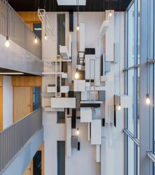 Conçue en étroite collaboration avec notre partenaire Pierre de Seine et les architectes du projet, cette œuvre en acier peint (10 x 6 x 5 m) s’ancre dans l’architecture du lieu en apportant mouvement et profondeur, comme une extension vibrante de l’édifice.